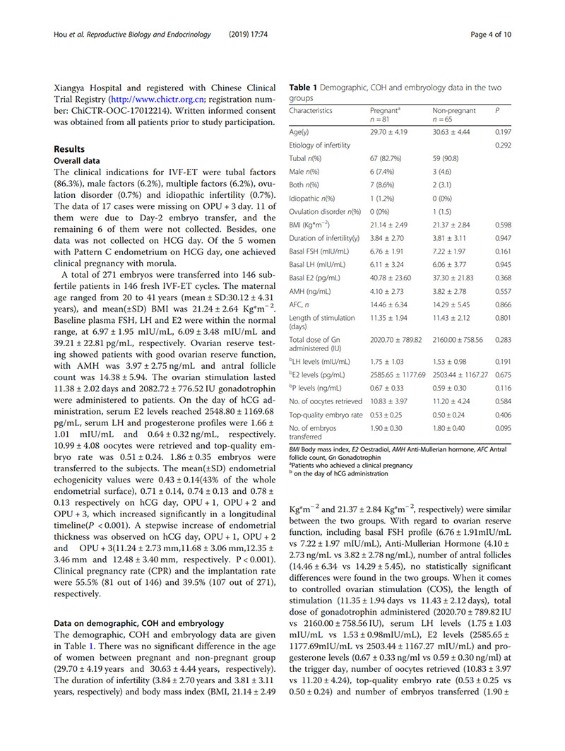 方法:在2017年8月至2018年8月,前瞻性隊(duì)列研究共招募了146名首次接受體外受精周期的不孕女性。監(jiān)測這些患者在hCG日和取卵后1-3天(OPU + 1, OPU + 2, OPU + 3)的子宮內(nèi)膜回聲模式。