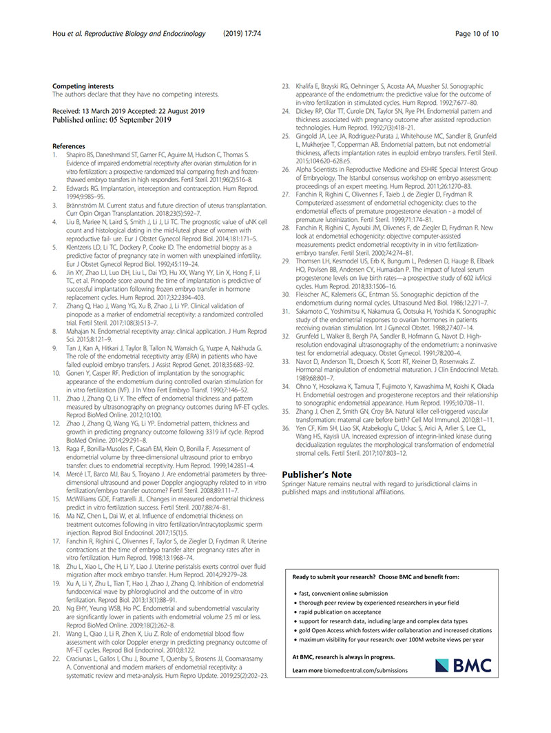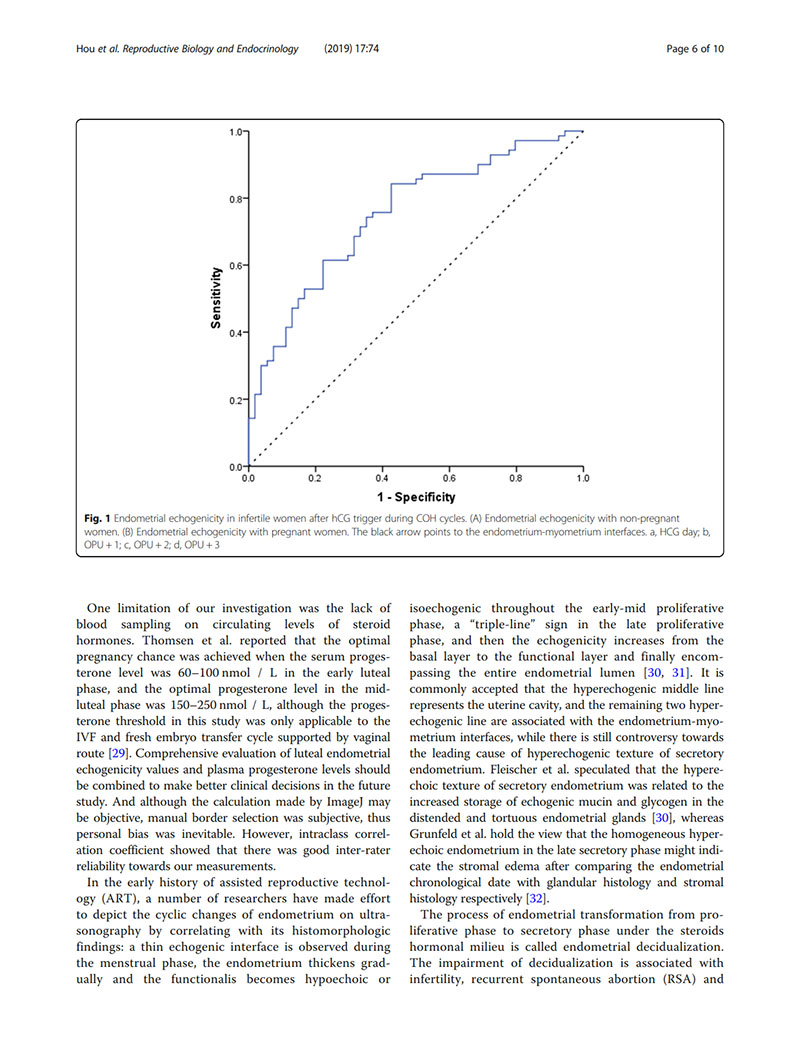 結(jié)論:建議用取卵后第2天(OPU+2)的子宮內(nèi)膜回聲值評價子宮內(nèi)膜容受性。當(dāng)OPU+2的回聲值<60%時,臨床醫(yī)生似乎適合提供“全冷凍”IVF周期,并在隨后的凍融胚胎周期中進(jìn)行移植。